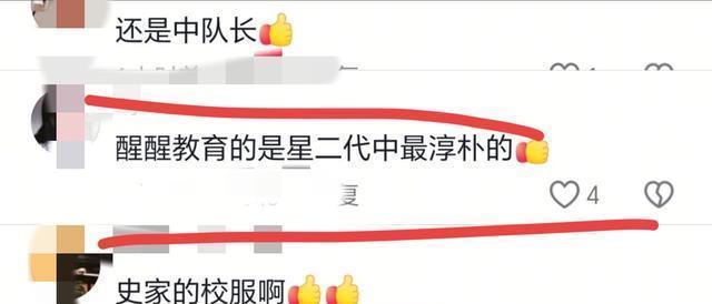 也有网友注意到,醒醒穿的这身蓝色的套装是学校的校服,并且醒醒的胳膊上还有一个“三道杠”的袖标。看来,9岁的醒醒在学校也是品学兼优的好学生。
