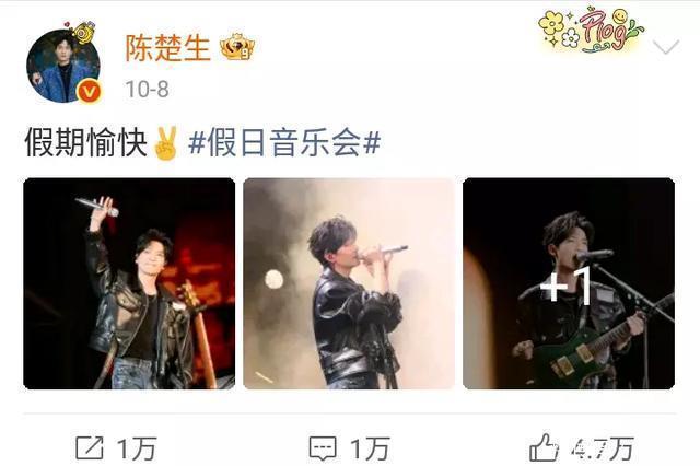 10月8日这一天,歌手陈楚生发文,“假期愉快”四个字,引人关注!陈楚生在发文下方公开了个人演出的照片,从而让网友看到歌王的风采!所以,国庆假期结束后,歌手们的发文与音乐,带给观众信心与力量!感谢周深,感谢陈楚生,你们在观众心目中是最棒的!国庆中秋假期结束,歌手的歌曲却温暖人心,伴随观众左右,成为他们追梦新的力量!