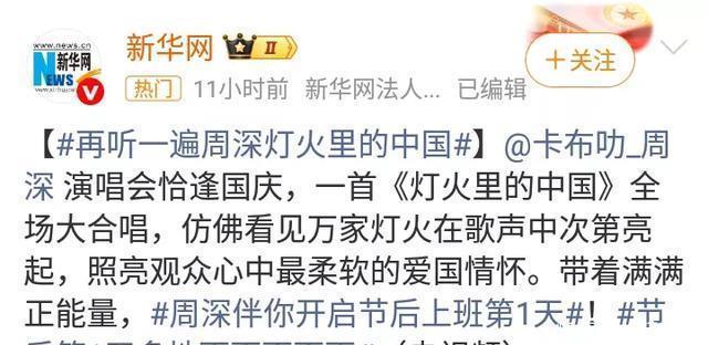 这一话题阅读量达到176万,互动量2.8万,讨论量5436。网友们热议起来,好评歌手周深!对此,新华网在社交平台发文,令人回味无穷!原来,新华网在文中提及歌手周深的事情,信息量好大。首先是演唱会,即周深举行的个人演唱会。 其次,提及周深演唱会恰逢国庆,一首《灯火里的中国》全场大合唱。由此可见,歌手周深的实力有多强。从个人到全场,从歌手到舞台,周深都把握的很好!最后,文中赞美周深的歌声:“仿佛看见万家灯火在歌声中次第亮起,照亮观众心中最柔软的爱国情怀。带着满满正能量,周深歌声伴你开启节后上班第一天。”
